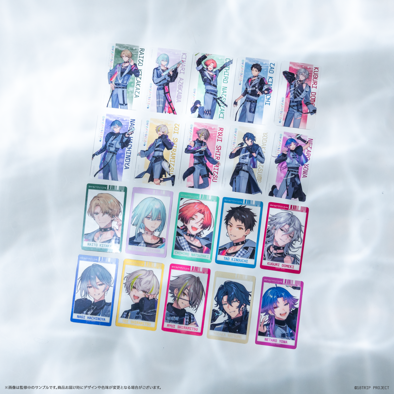 Ev3ns・L4mps(北片 來人、畔川 幾成、夏焼 千弥、木ノ内 太緒、百目鬼 潜、蜂乃屋 凪、白光 糖衣、白光 琉衣、棗 夜鷹、夜半 子タろ)の各2絵柄ランダム20種。